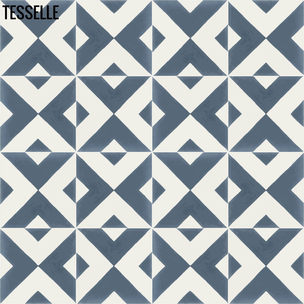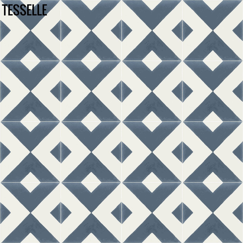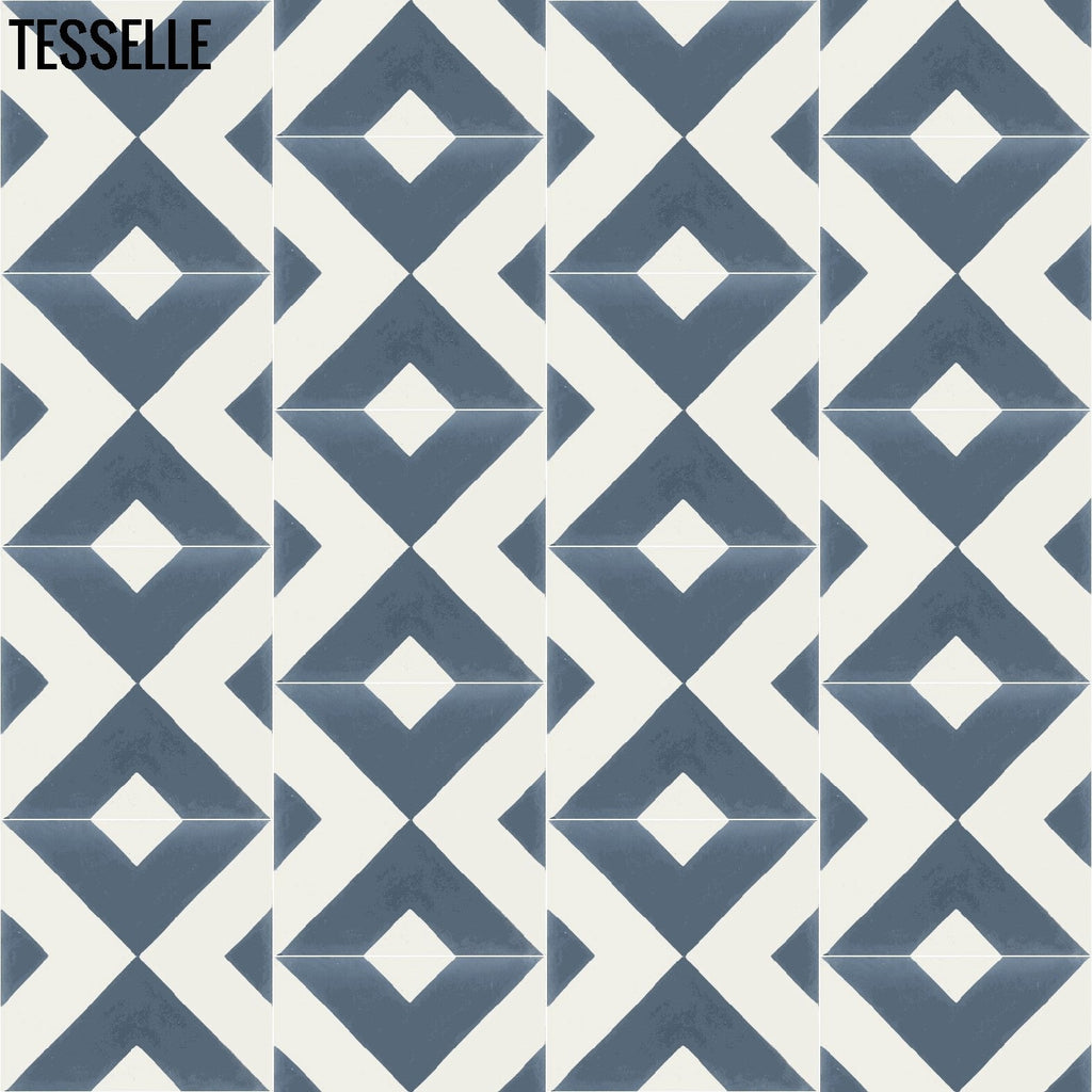 Korvette Ocean will create a classic harlequin-inspired diamond pattern across your surface. Each tile is hand-pressed. The design pairs crisp white with a navy blue hue, creating a high-contrast pattern that reads modern, graphic, and effortlessly clean.