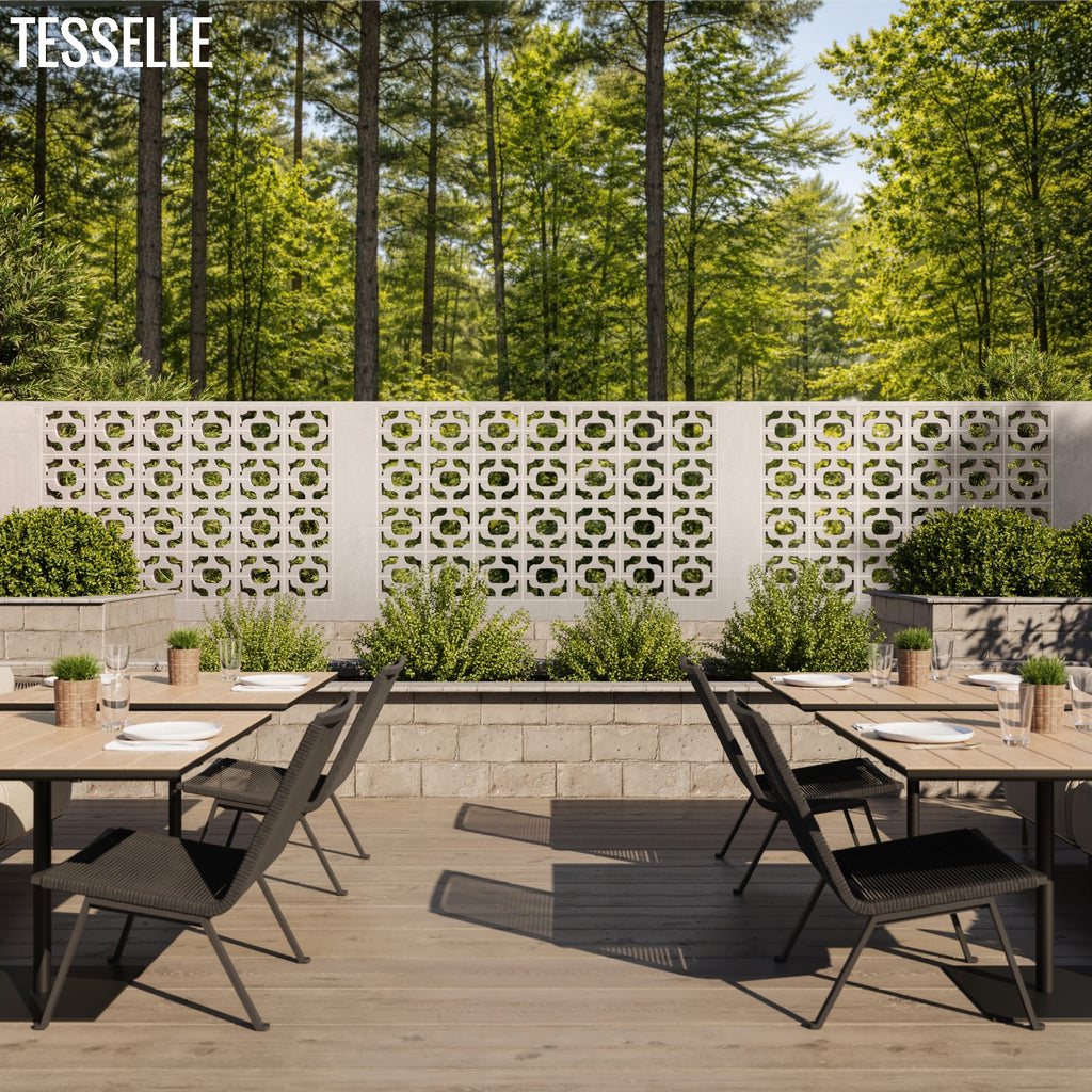 Tesselle Breeze Blocks offer a modern reinterpretation of a material beloved by mid-century architects. Made with fine sand aggregate and precision-pressed for a smooth, double-sided finish, they provide a clean, refined look that outshines traditional screen blocks.