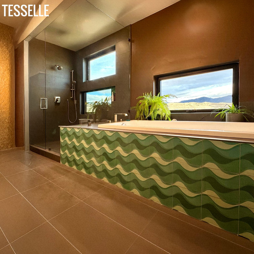 Exclusively available from Tesselle, Carpi Aqua 8x8" Square Cement Tiles designed by Trina Turk, offers a blend of blue green hues, and forms a pattern reminiscent of vibrant ocean waves. See all Capri colors. See all Trina Turk Products.