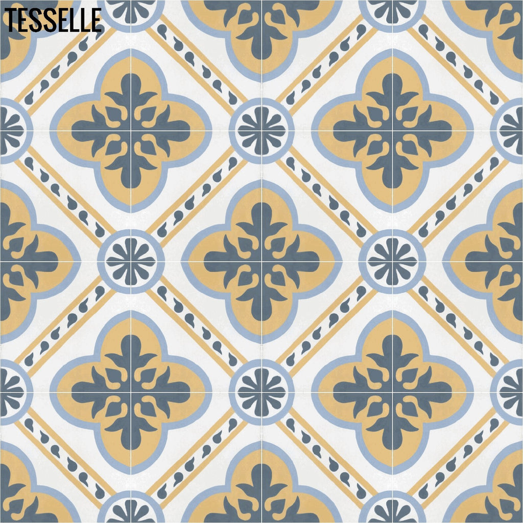 Colette Toulon features a bright and lively palette of navy, sky blue, soft yellow, and white, creating a classic, floral botanical pattern across your surface. Each tile is hand-pressed.