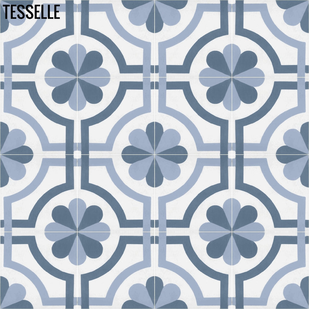 Margarita Azul features a soft, palette of French blue and navy set against a white background. The pattern combines sweeping curves with stylized petal and teardrop shapes, creating a balanced blend of geometry and organic form. Each tile is hand-pressed.
